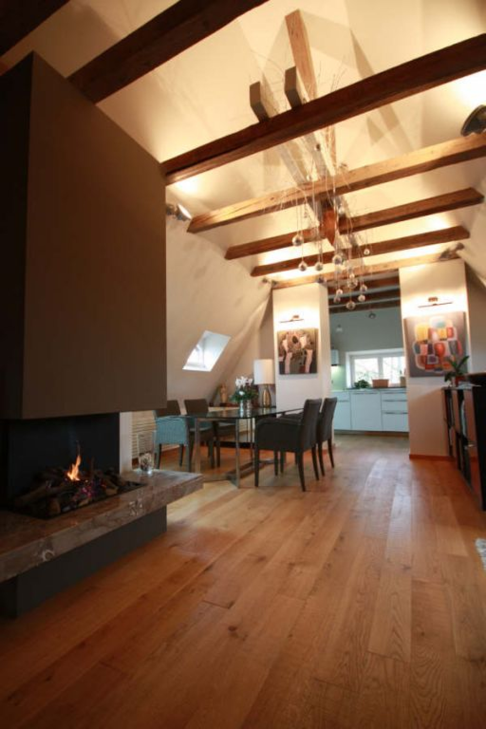 Prestations haut de gamme : parquet massif, cheminée au gaz, climatisation, et une cuisine ainsi qu'une salle de bains contemporaines