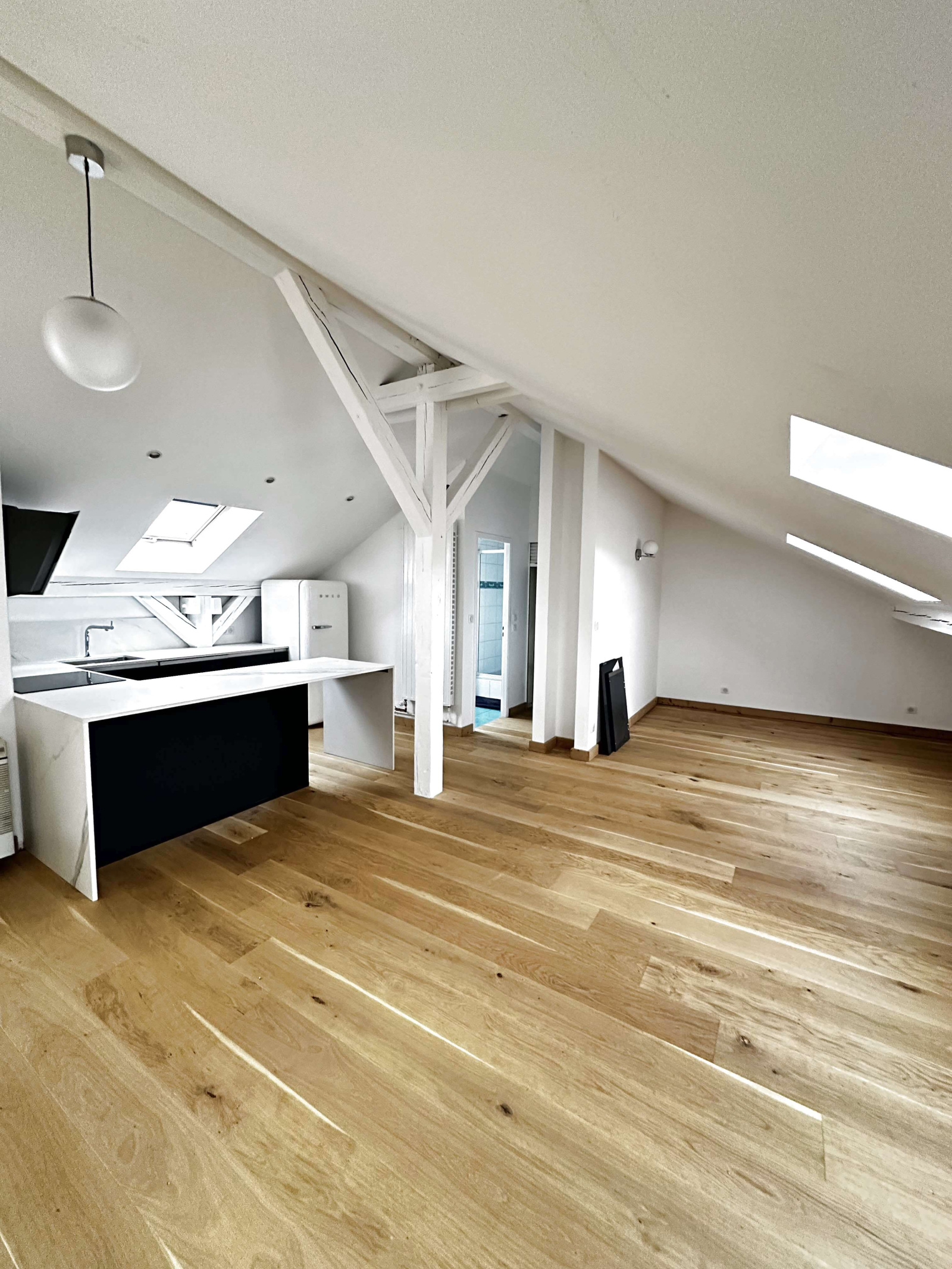 Côté jour: il propose une entrée ouverte sur un double salon et cuisine équipée neuve avec grande baie vitrée.