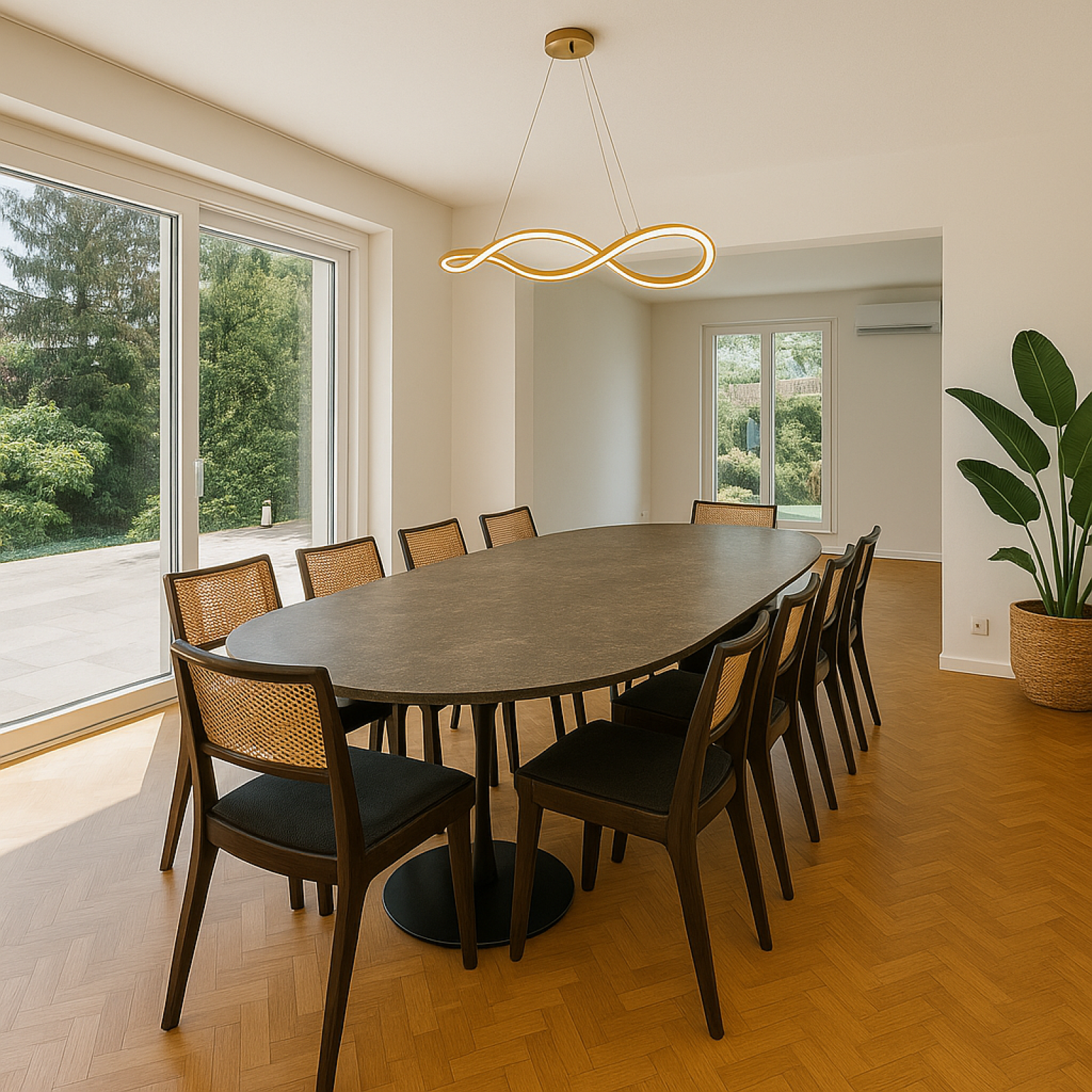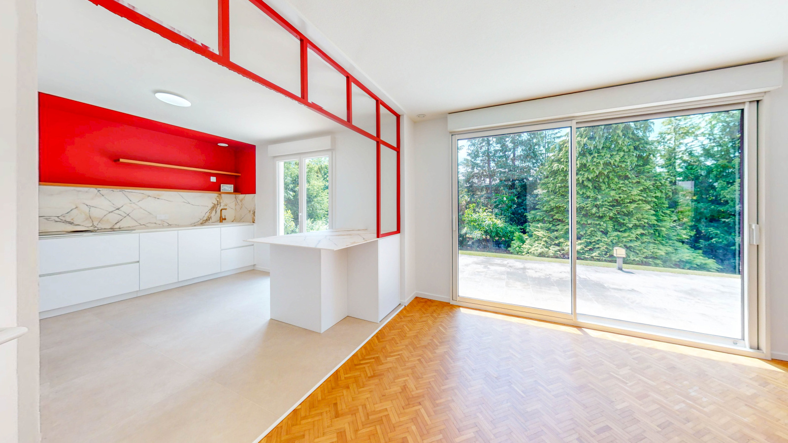 Jeux de lumière naturelle renforcés par de larges ouvertures sur le jardin