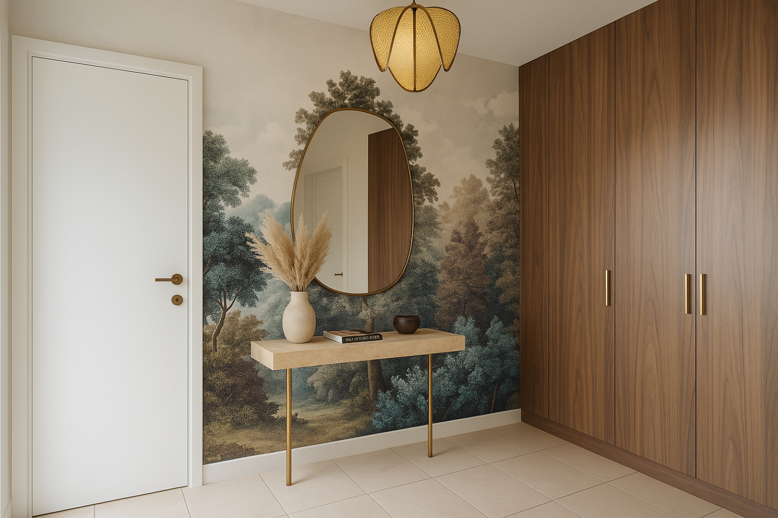 Entrée avec placards sur mesure et décoration murale forte