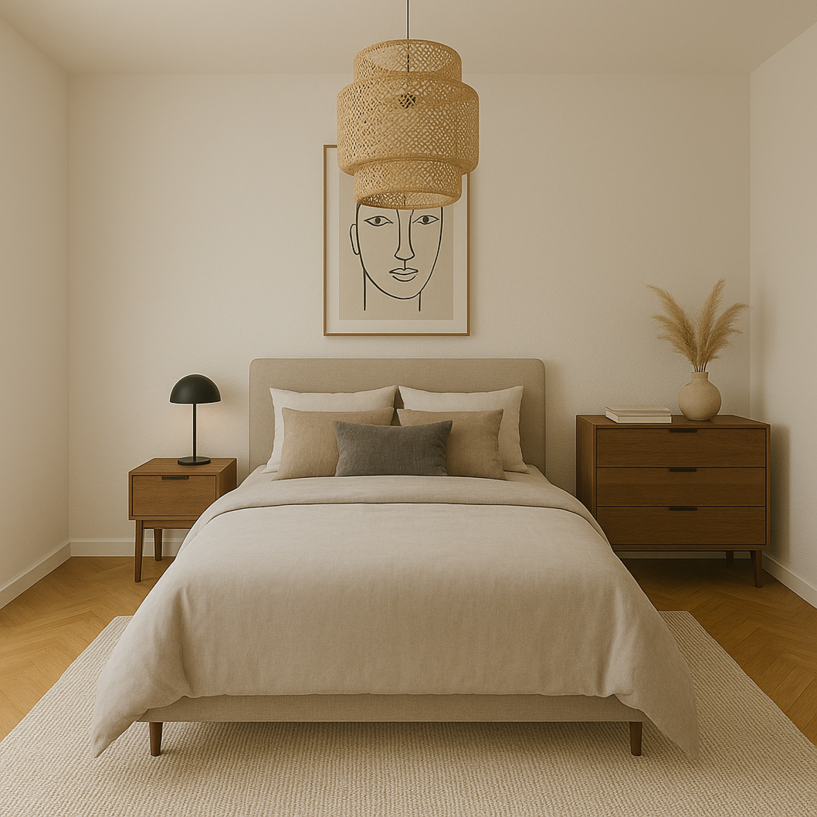 Ambiance contemporaine sobre et raffinée : murs aux tons neutres, contrastes bois/pierre, revêtements muraux graphiques
